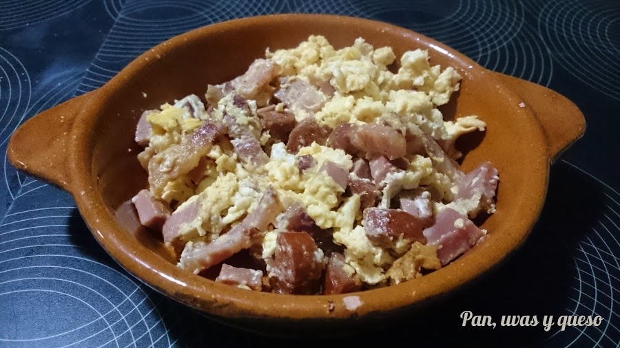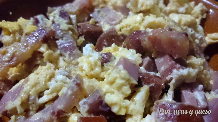 Cuando el chorizo esté cocinado, echamos los huevos y dejamos que se cuajen. Cuando estén casi cuajados, removemos bien para que se mezclen todos los ingredientes.