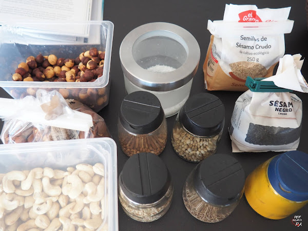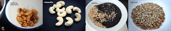 Tostar los anacardos y las pipas de girasol. Mezclar con las avellanas y las almendras tostadas. Trocear con ayuda del mortero y reservar.Poner una sartén al fuego y tostar las semillas de sésamo hasta que empiecen a saltar. Retirar y dejar atemperar.