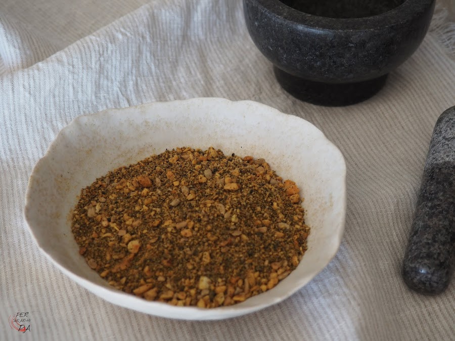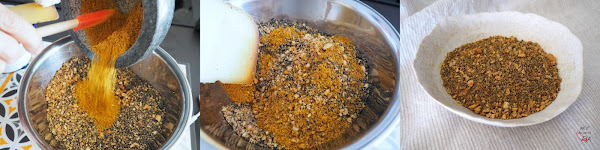 Colocar las semillas en un mortero y picarlas. Añadir la cúrcuma y la sal y mezclar bien, reservar.