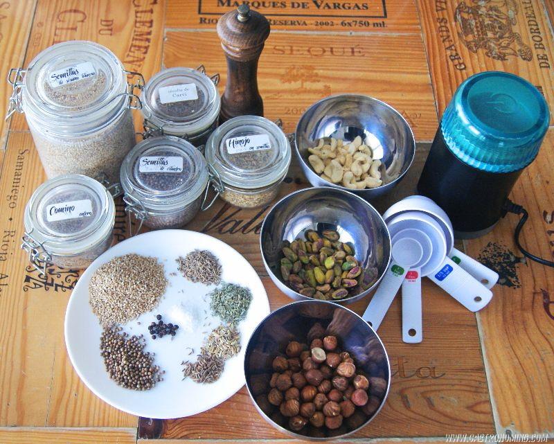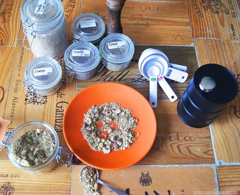 Mientras se tuesta nuestra primera mezcla, añadimos el resto de ingredientes, menos la sal, al molinillo y trituramos más que la mezcla anterior, pero tampoco la reduzcas a polvo del todo, recuerda que esta es una mezcla con textura.
