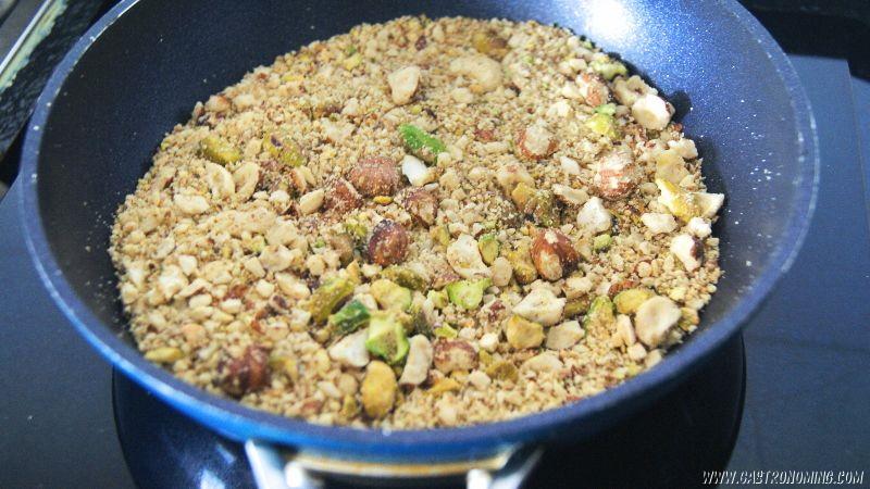 Ponemos en un molinillo eléctrico, licuadora o triturador de alimentos las almendras, anacardos, pistachos y 1 cucharada de semillas de sésamo, la otra la guardamos para añadirla enteras, trituramos muy poco, solo unos segundos y mejor si lo hacemos por tandas, lo suficiente para romperlos y dejarlos en trocitos pequeños, poco más pequeños que un guisante, no debe ser polvo, ni debe ser pasta, aunque algo de polvo te quedará, es normal. Ten cuidado, porque si te pasas, harás “mantequilla”. Sino, siempre puedes picarlas o machacarlas manualmente. Si quieres, también puedes tostar los frutos primero antes de triturarlos, como veas, ambas tienen sus pro y sus contras, pero da igual.Añadimos esta mezcla a una sartén (sin aceite) a fuego medio y vamos moviendo constantemente para que no se quemen unos 7-8 minutos.
