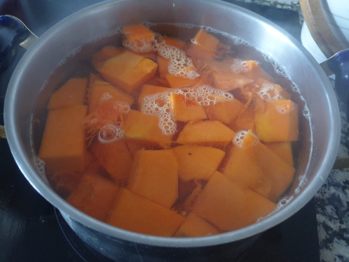 Para elaborar este saludable dulce utilizaremos la variedad de calabaza que me gusta especialmente y que podemos encontrar sin problemas en nuestros mercados es la Butternut o Cacahuete. Su piel es mas dura, de un color mas apagado, entre naranja y amarillo. La pulpa de color naranja intenso, y su sabor tiende a fruto seco con notas de nuez moscada. Esta variedad es ideal para preparaciones dulces. Una delicia. Para mi gusto la forma de cocción asada es tambien la forma mas fácil de extraer todo el sabor concentrado en su pulpa, aunque en esta preparación he decidico prepararla cocida para que se incorpore mayor cantidad de agua ¡Malditas dietas! jeje.