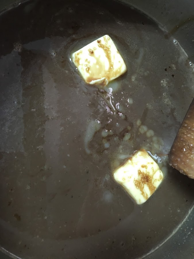 Añadimos las dos cucharadas de mantequilla y lo removemos todo hasta que se funda. Lo dejamos al fuego hasta que llegue a ebullción.