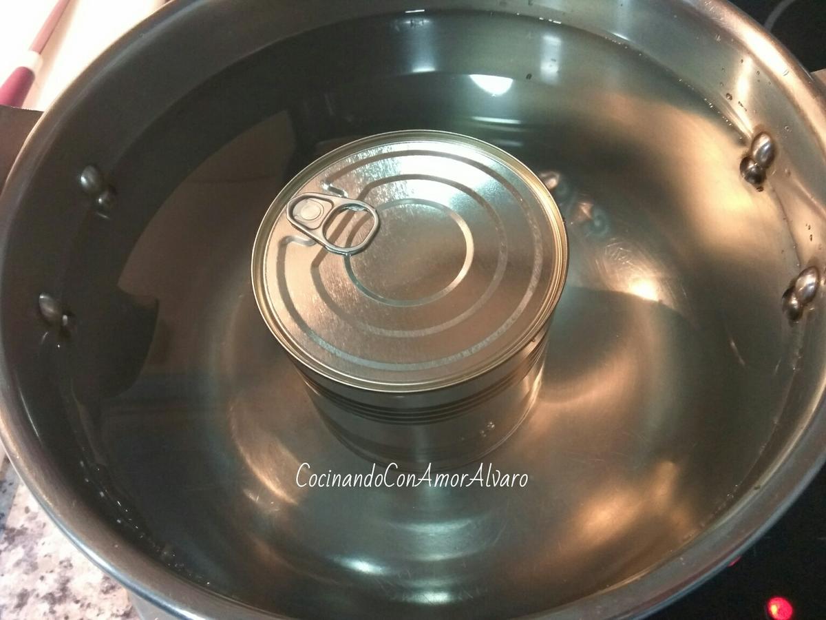 Cogemos el bote de leche condensada con un paño, así no nos quemaremos.