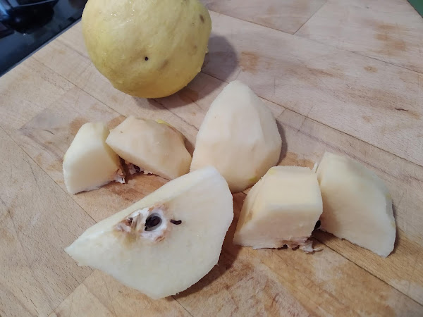 Pelar los membrillos, cortar en trozos y retirar las semillas.