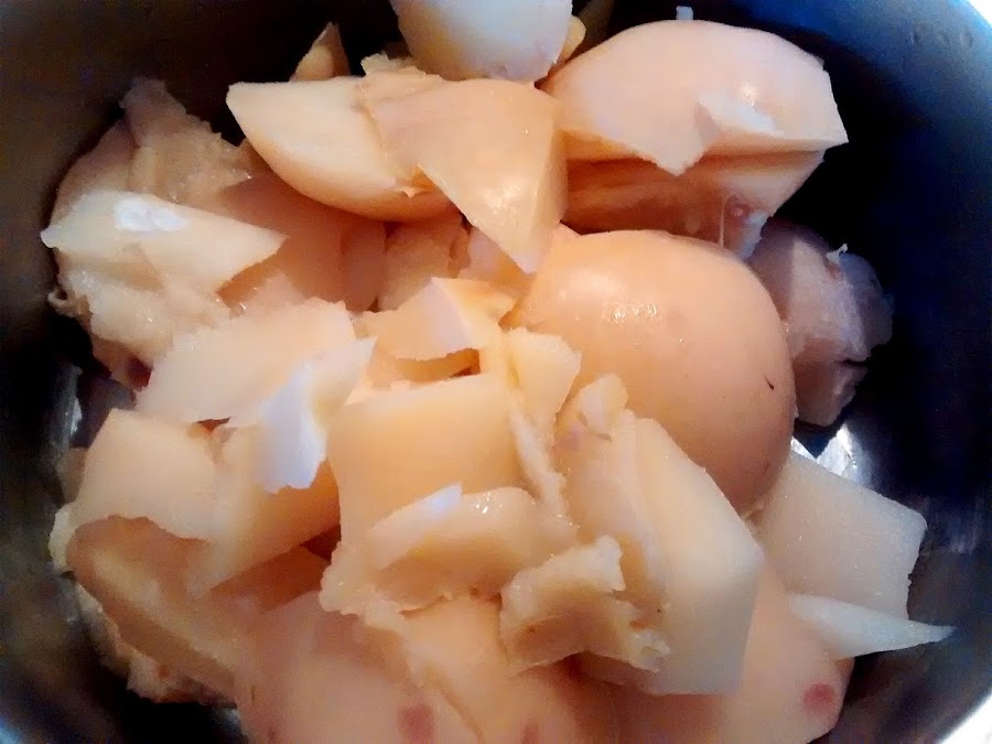 1. Poner los membrillos con cáscara, en una olla con agua fría y cocer por media hora. Con esto lograremos que queden más blandos. Una vez cumplido el tiempo, retirar, dejar enfriar un poco y sacar el centro con las pepitas. El agua sobrante puedes usarla para hacer zumo si lo prefieres.