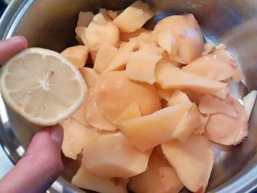 2. Cortar la pulpa con la cáscara -que al cocinar te darás cuenta que es es una piel muy fina- y poner en una olla junto con el azúcar y el zumo de limón. Aquí es cuando tienes que armarte de paciencia y dejar de hacer cualquier otra actividad, porque el dulce de membrillo necesitará toda tu atención. Revolver constantemente con una cuchara idealmente de palo -yo usé una paleta- sin dejar que se pegue en la olla. Esto lo harás por alrededor de 40 minutos (ese es el tiempo que ocupé yo porque era menos cantidad) o hasta que veas que el membrillo se torna de un color más marrón, toma la consistencia de un puré y se vuelve pesado al revolver.