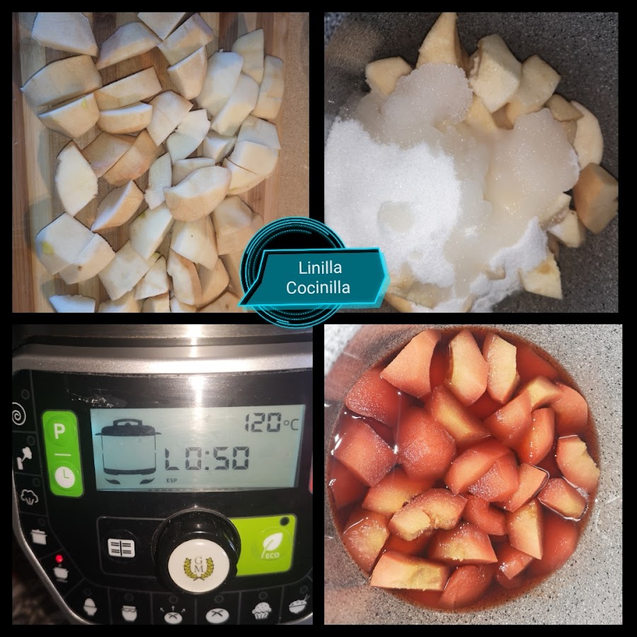 2. Introducimos el membrillo a la cubeta de la olla junto con el resto de ingredientes y programamos menú fuego lento/120ºC/50 minutos.