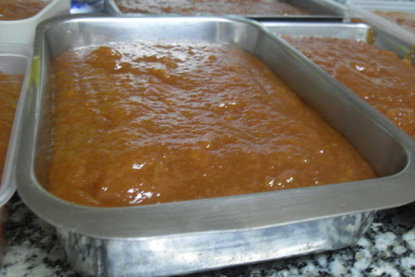 Se aconseja que por Kg de fruta pelada y cocida agrega 1 kg de azúcar. Si no se quiere tan dulce se puede poner un 70% ( 750g) pero no menos que si no la textura no queda consistente y no se conserva bien. Este fue mi caso, yo he puesto un 70% más o menos.