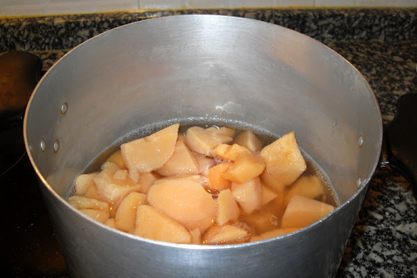 Preparación:Pelar los membrillos, descorazonar y cortar en trozos y cubrir con agua y el zumo de los limones para que la fruta no se oxide.