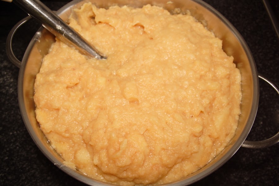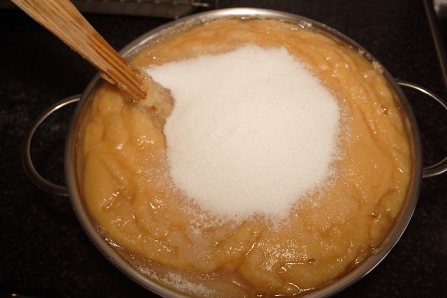 Volvemos a ponerlo en la olla junto con el azúcar (ya sabéis,700 gr por cada kilo de membrillo), encendemos el fuego y lo tendremos cociendo hasta que quede una masa, mas bien espesa, también nos podemos guiar por el color, cuanto mas lo dejamos cocer, mas morenito se pone el membrillo.