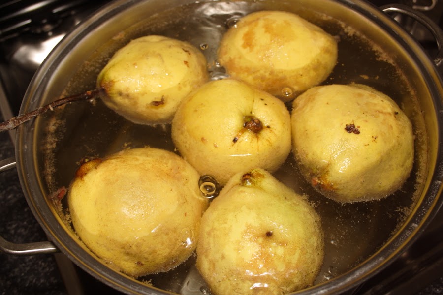 Para que se pelen mejor los membrillos, los podemos escaldar, es decir, ponemos una olla grande, con bastante agua, en el fuego hasta que hierva, y vamos metiendo los membrillos. Los dejaremos unos 5 minutos y los sacamos.
