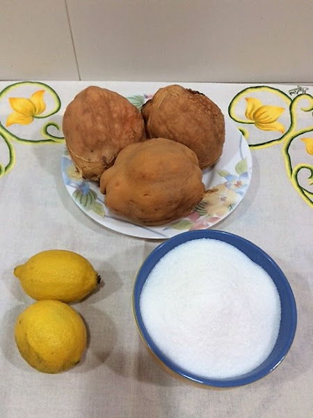 Troceo los membrillos y pelo los limones para añadirse-lo,eso si les quito toda la parte blanca y las pepitas y añado también el kgr de azúcar,ya todo junto en la cacerola lo pongo al fuego y lo voy removiendo hasta que empieza a hervir,cuando empieza tengo un cucharon grande para remover lo,porque los borbotones al cocer si te alcanzan puedes quemarte.
