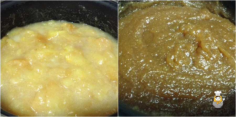 En una olla alta, ponemos el membrillo batido y el azúcar y dejamos cocer a fuego bajo durante más o menos 1 hora y media o hasta que la mezcla esté muy espesa. Debemos revolver muy a menudo, yo lo hago cada 10 minutos para evitar que se pegue. Durante el tiempo de cocción veremos como la carne va cambiando de color, oscureciéndose, hasta alcanzar un tono rojizo oscuro.