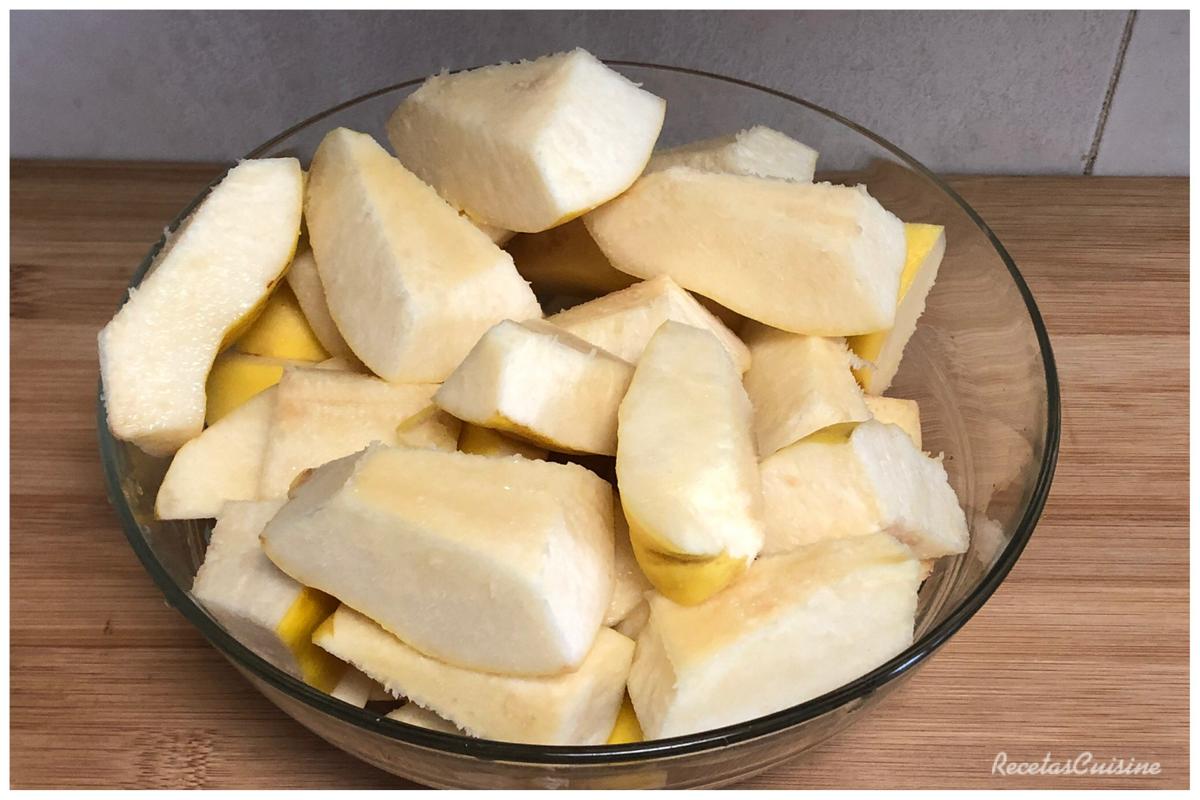1. Comenzamos lavando bien los membrillos ya que los usaremos con la piel. Una vez limpios, los secamos y los cortamos en trozos para quitar las semillas y la parte del corazón.