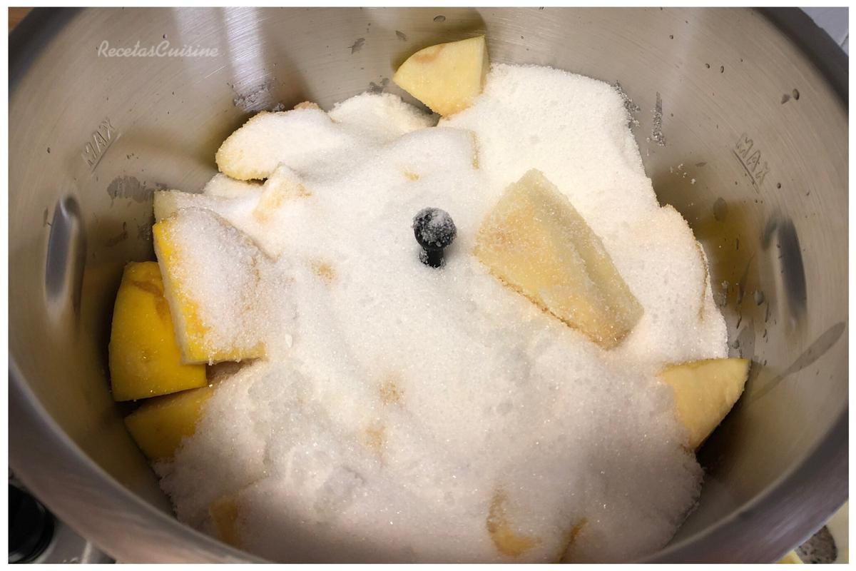2. Equipamos el robot con la cuchilla de amasar/picar. Ponemos en el bol el membrillo troceado, el azúcar y lo que nos quede de zumo de limón. Mezclamos con velocidad 8 unos 10 segundos.