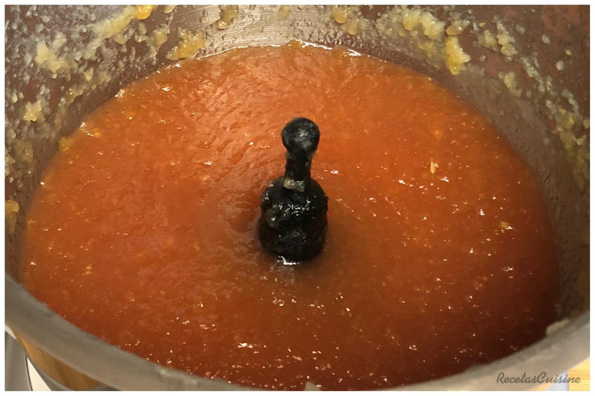 5. Por último, trituramos con velocidad 10-12 durante 30 segundos aprox. y lo tendremos listo para repartir en los moldes que hayamos elegido. Lo repartiremos sin demora, puesto que a medida que enfría, se va compactando. Dejamos destapado hasta que enfríe bien, y después lo tapamos y dejamos que repose de un día para otro.