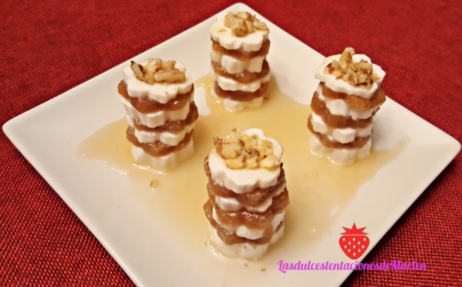 Con las piezas ya listas lo único que hay que hacer es colocar una capa encima de otra, alternando el membrillo y el queso. Os aconsejo que no pongáis más de 7. Para que quede bien y no demasiado dulce.