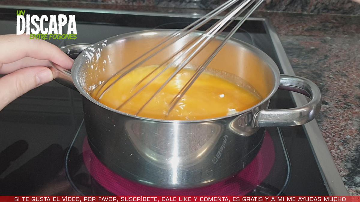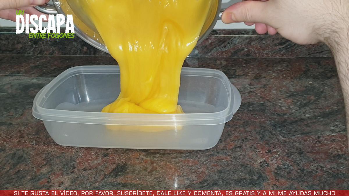 4 Cuando la mezcla ha espesado y tiene una textura como esta, apartamos el cazo del fuego. Y volcamos la mezcla a un recipiente, rebañamos bien con la ayuda de una lengua. Repartimos bien la mezcla y procuramos que quede lo más lisa posible, le damos unos golpes para evitar que se formen burbujas en el interior. Dejamos que se atempere y después lo mentemos en la nevera un mínimo de 4 horas más o menos, yo lo voy a dejar toda la noche.