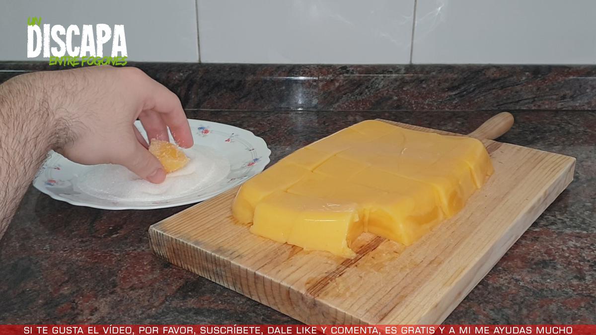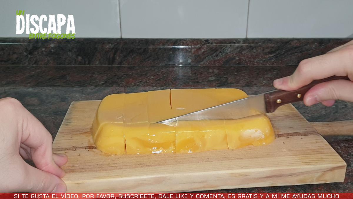 5 Cuando ya han pasado mínimo 4 horas, lo desmoldamos y lo cortamos, yo lo voy a cortar en cuadraditos, vosotros cortarlo de la manera que queráis.