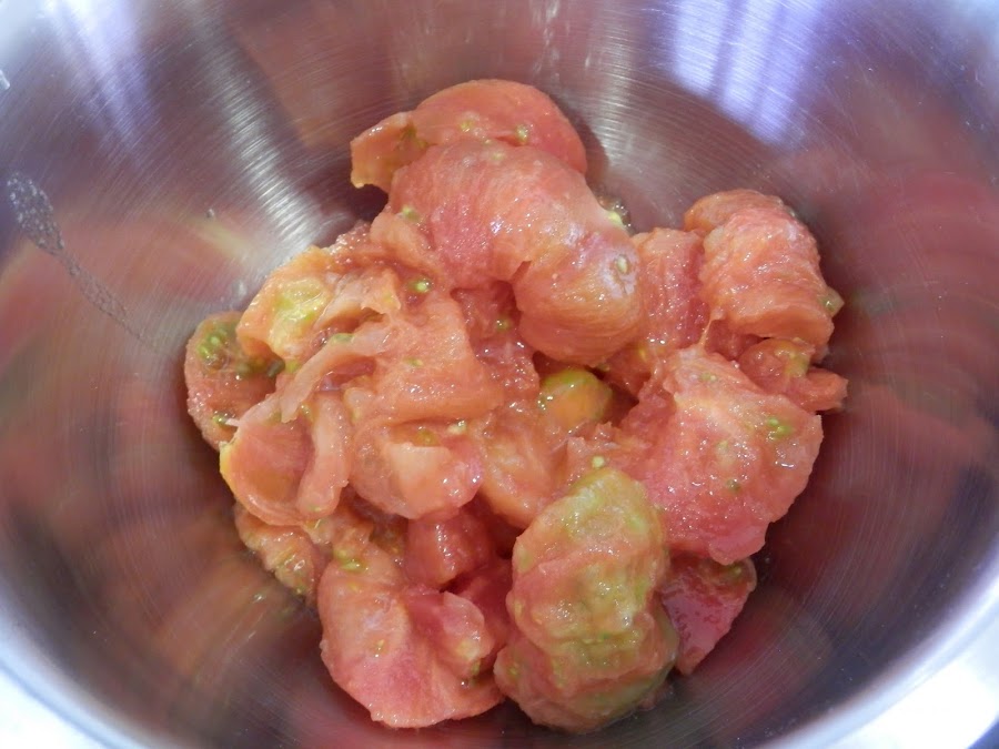 Pela los tomates y retira el culo y los nervios que puedan quedar.