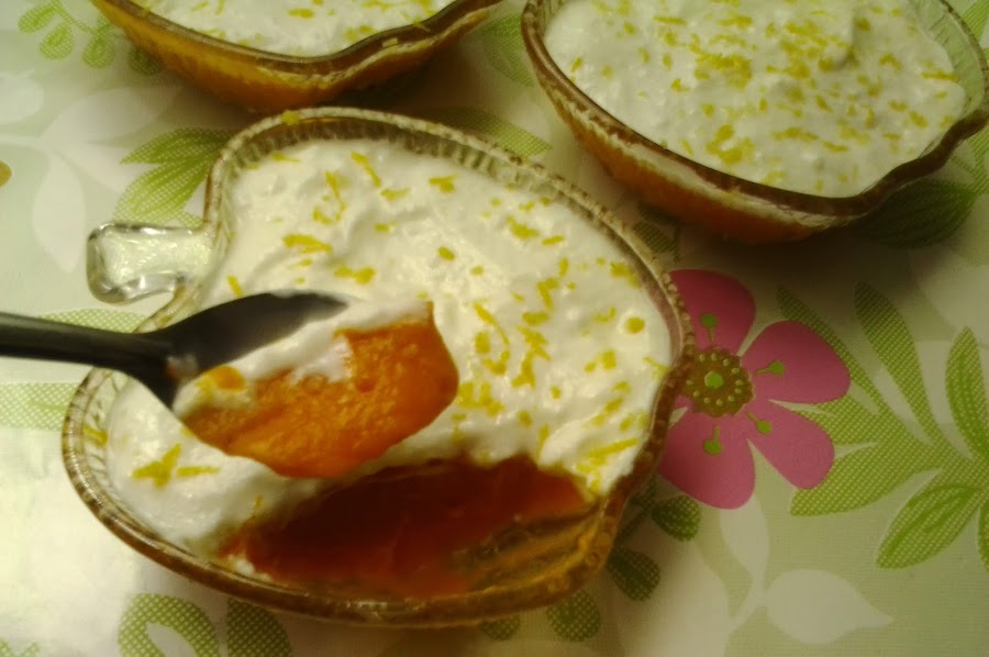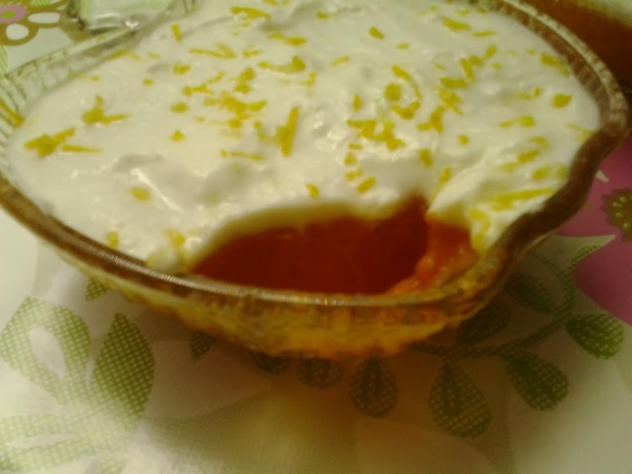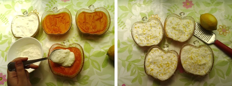 Para decorar, mezcla en un cuenco dos yogures con ralladura de limón y espárcela encima del dulce de zanahoria.