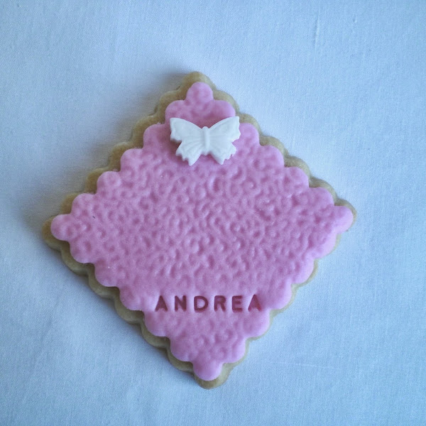 La galleta decorada con pasta de azúcar, con el nombre impreso y decorada con una mariposa.
