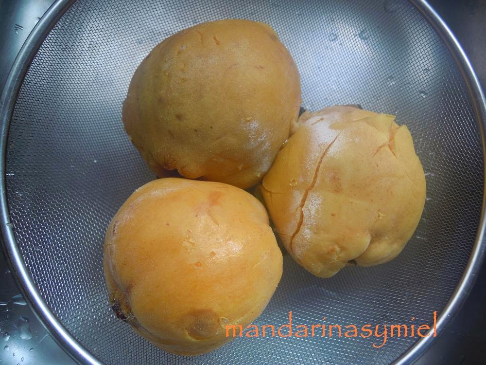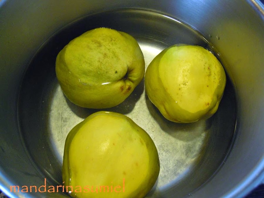 Elige los membrillos que sean del mismo tamaño más o menos, lávalos y ponlos a cocer en agua hirviendo hasta que estén tiernos, sobre una hora, el tiempo dependerá del tamaño de los membrillos. Comprueba que están cocidos pinchando con un palillo largo, si entra fácilmente ya están hechos.