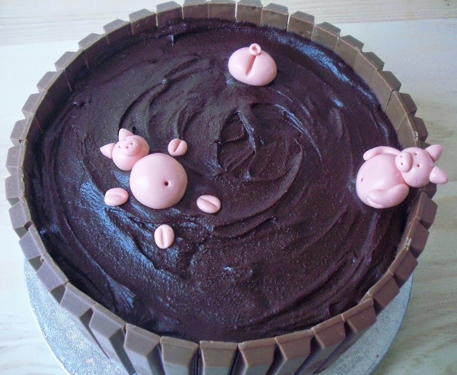La tarta consiste en 4 bizcochos de chocolate, rellenos de dos capas de crema de queso y una capa de crema de ferrero, recubierto de ganache de chocolate y decorado con Kit Kats y cerditos hechos en fondant.