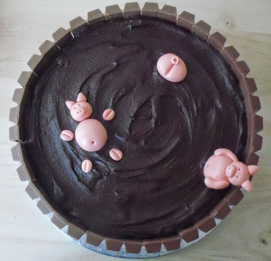 Ahora viene la decoración de los cerditos. Como quería que pareciese lodo eché unas cucharadas del ganache y las extendí con el culo de la cuchara formando ondas, coloqué los cerditos y a la nevera hasta el día siguiente.