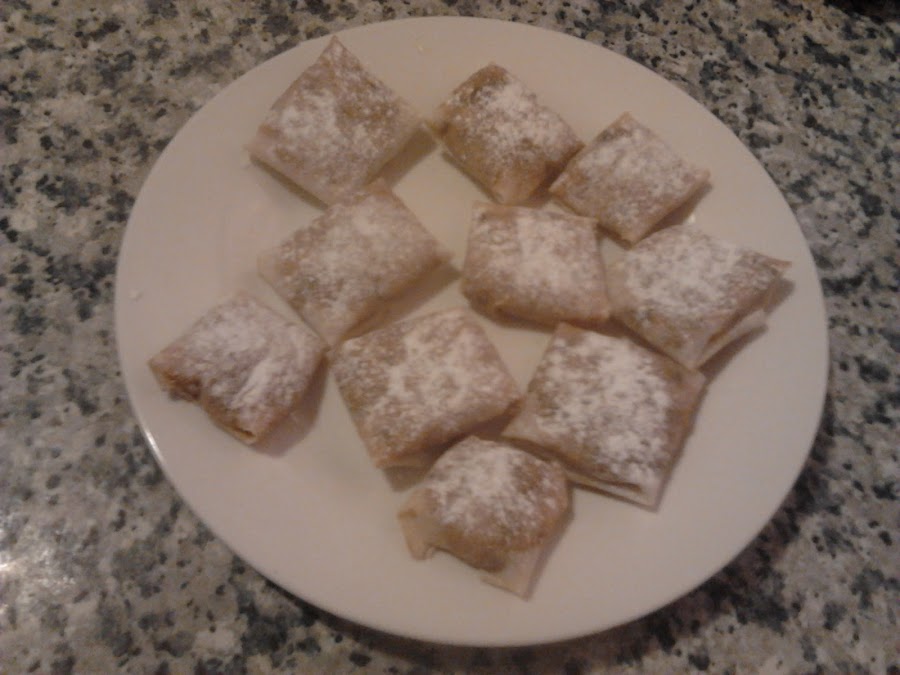Luego hice unos DULCES DE DATILES, medio invención mia pues las recetas que encontré llevaba siempre almendras y yo le añadí datiles, me quedaron riquismos, hechos con pasta filo.