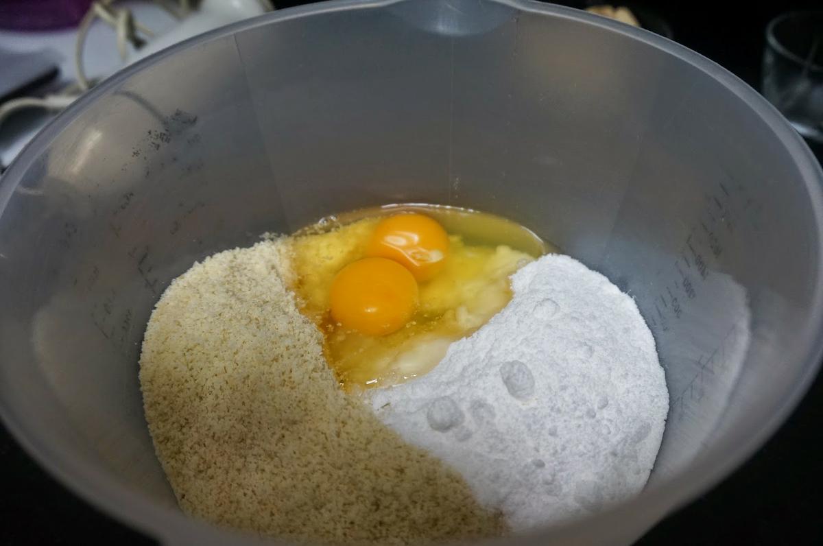 En un recipiente pondremos la almendra molida, los huevos y el azúcar.