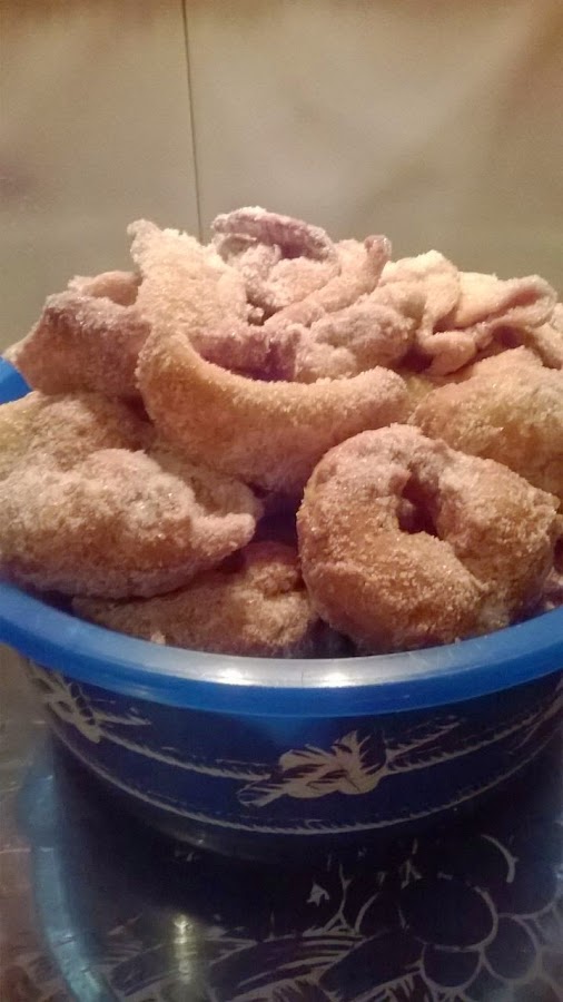 Mi madre va poniendo las medidas de los ingredientes y entre todas vamos mezclando, moviendo, amasando y dando forma a esta maravilla de dulces: