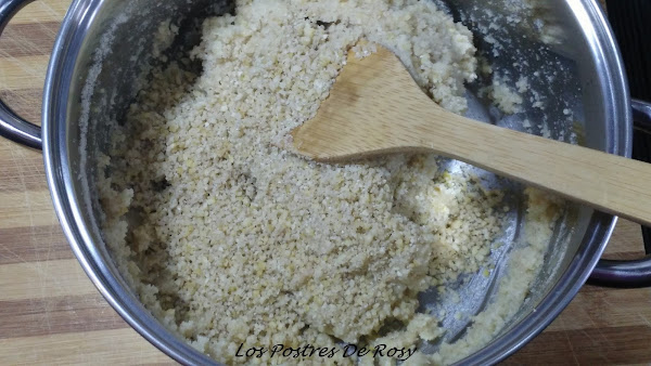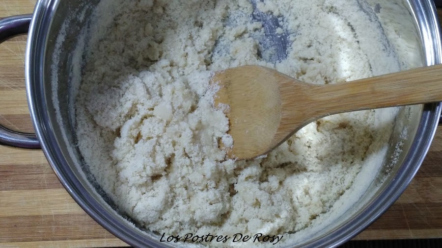 - Apagamos el fuego y corriendo volcamos la harina de almendra, mezclamos bien con una cuchara de madera.
