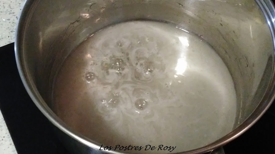- En un cazo mediano, o cazuela, ponemos la fructosa y el agua y cocinamos hasta que comience a hervir y la fructosa esté disuelta por completo (almíbar).