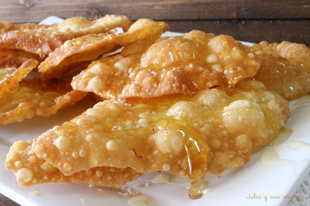 Un dulce muy típico también de mi comunidad Castilla-La Mancha, son muy parecidas a las orejas de carnaval pero van servidas con miel en vez de azúcar, las podéis ver en mi blog Julia y sus recetas.