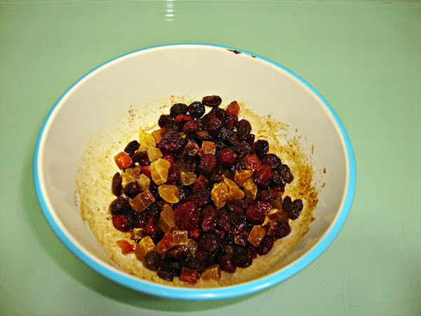 En un cuenco ponemos las nueces, las pasas, las frutas desecadas, la canela y el café y lo regamos con el ron, lo vamos moviendo de vez en cuando para que todo quede bien envuelto.