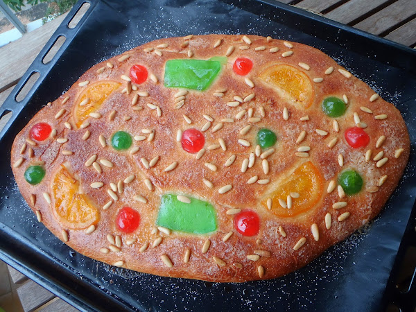 Se trata de preparar una masa tipo brioche con huevos, harina, levadura, azúcar, mantequilla.... Se deja levar, se estira sobre una bandeja sin que quede demasiado fina, se decora con fruta escarchada y piñones, y por último, se hornea el tiempo necesario. Si todavía no la habéis probado os animo a que lo hagáis, porque el resultado es fantástico.