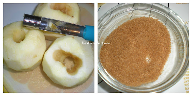 Descorazonar las manzanas. Mezclar un poco de azúcar moreno con canela.