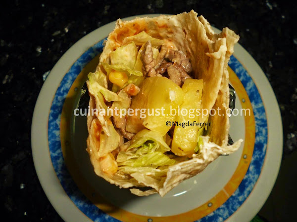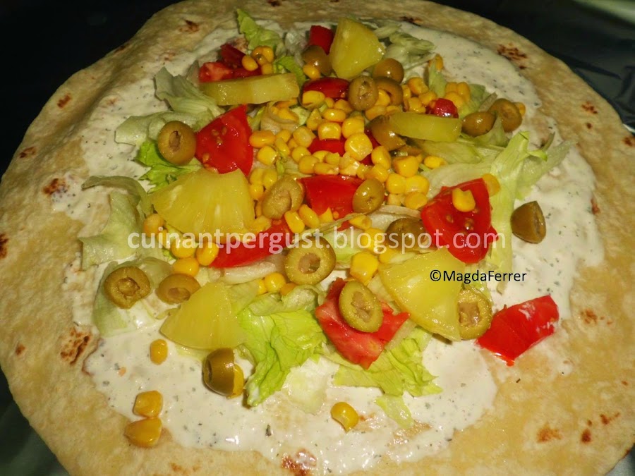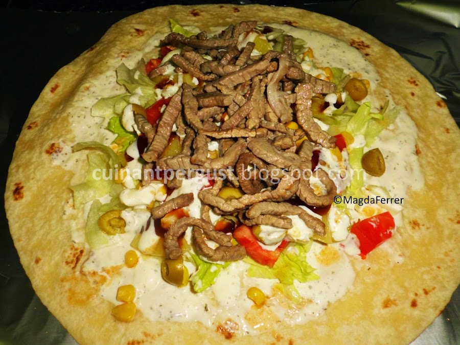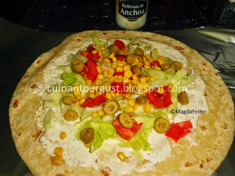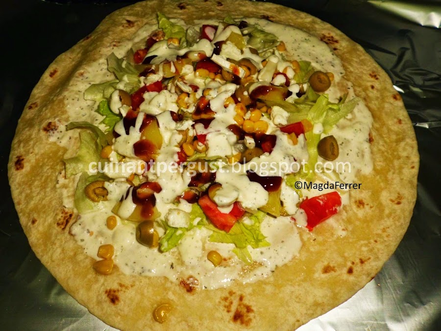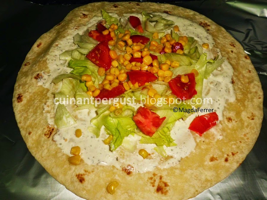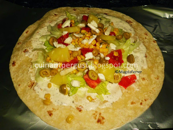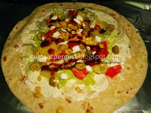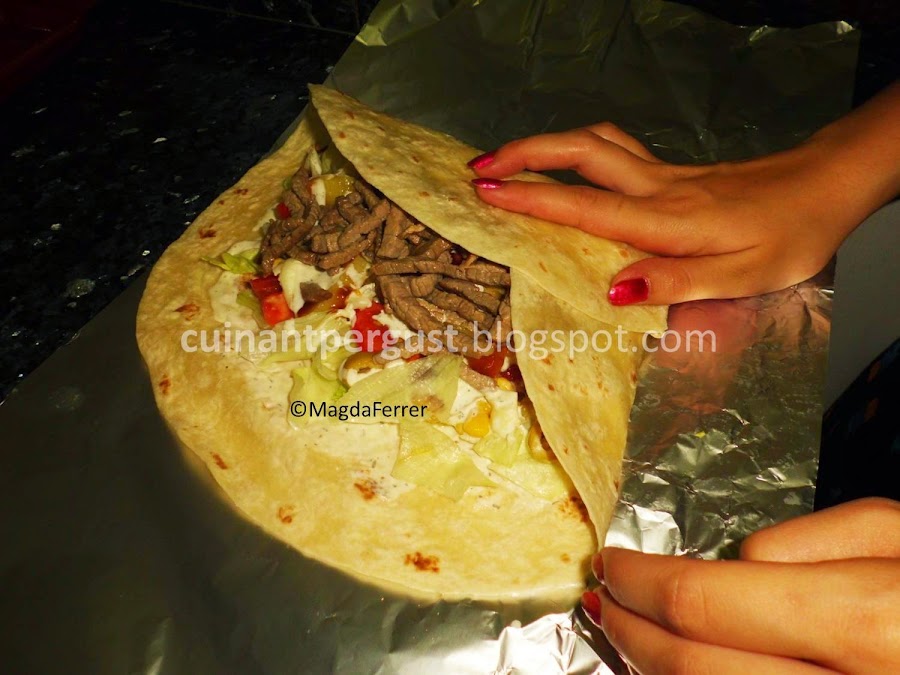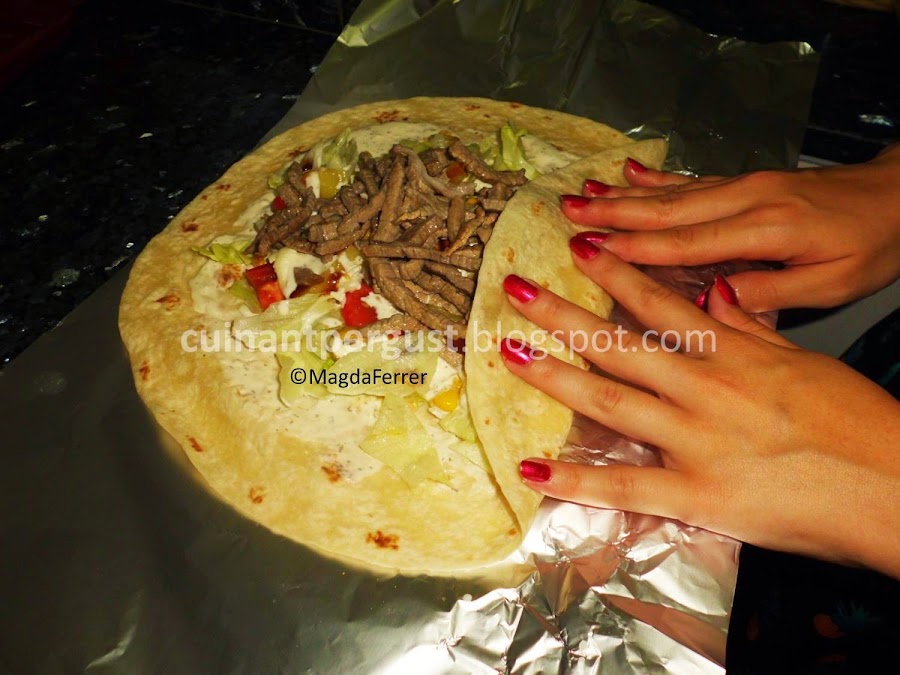 Disponer la tortilla sobre un trozo de papel de aluminio grande. Poner los ingredientes deseados sobre la tortilla. Enrollar la tortilla, empezando desde la base, para que las salsas no goteen y siguiendo por los laterales. Envolver la tortilla con el papel de aluminio, empezando también por la base y siguiendo por los laterales. Servir. Ir desechando el papel de aluminio a medida que se va comiendo para evitar el goteo.