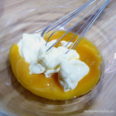 En otro recipiente batimos las yemas y le agregamos la leche y la mantequilla. Batimos esto muy bien.