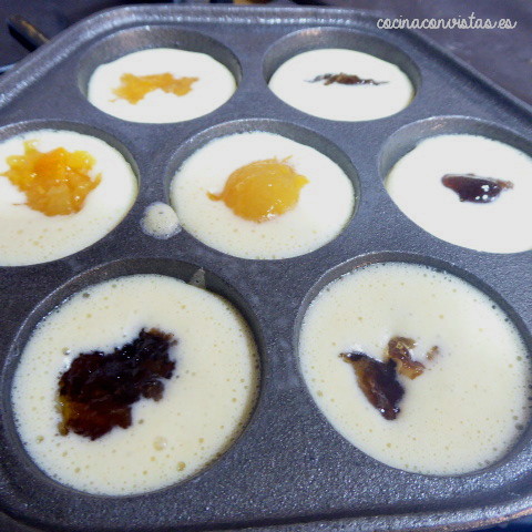 Dejamos reposar mientras rociamos con spray para cocinar (o untamos con aceite de girasol) los huecos de nuestra sartén. Ponemos la sartén a fuego medio y cuando esté tibia añadimos 2 C. soperas de la masa en cada agujero (como 1/3). Agregamos 1 C. de café de nuestra mermelada preferida
