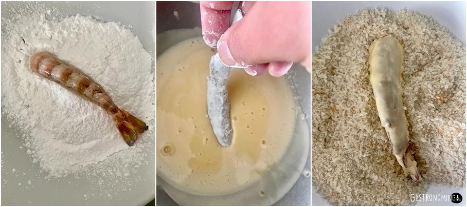 4. Ponemos a calentar nuestro aceite de fritura hasta que alcance los 180ºC. Mientras, pasamos los langostinos uno a uno, primero por la fécula, bien cubiertos, luego por la mezcla de fécula, huevo y leche y por último por el panko. Asegúrate que queden bien cubierto por cada unos de los elementos. Reservar.