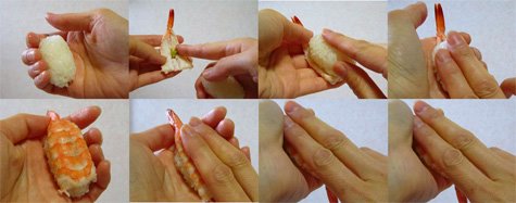 14. Coloca una bolita de arroz sobre cada gamba. Con la parte untada de wasabi hacia arriba, pon la bolita de arroz sobre ella. Comprime ligeramente la preparación.