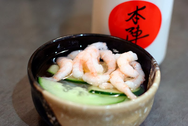 3. Ralla el jengibre y mezclalo en un cuenco grande con el vinagre de arroz, la salsa de soja y el azúcar, removiendo bien hasta que el azúcar se disuelva. Echa las gambas y el pepino en la mezcla y mételo en la nevera durante una hora para que se adobe.