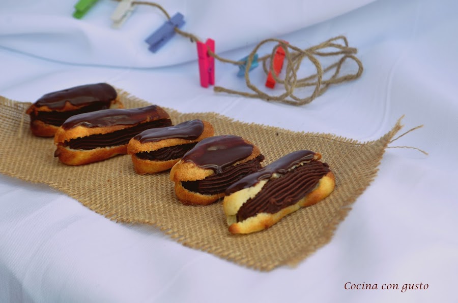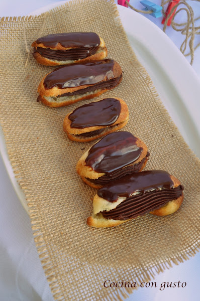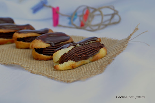 8. Meter el chocolate en una manga con boquilla rizada y rellenar los eclairs. Si estuviera demasiado dura, meter de 5 en 5 segundos en el micro para calentarlo un poco, no mucho que se quedará liquido y ya no se podrá meter ea la manga.