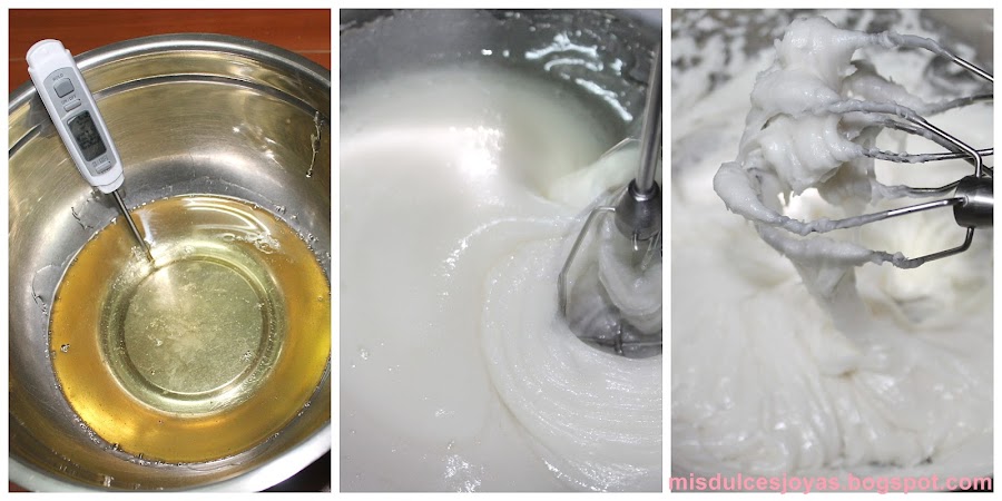 Llevar al fuego el azúcar blanco, el agua y el sirope de maíz. Calentar la mezcla hasta