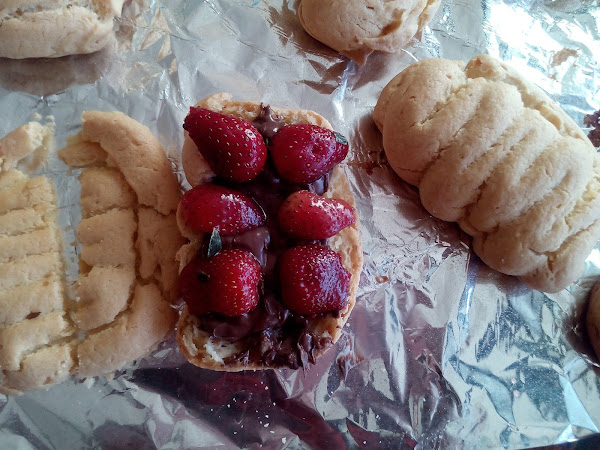 Luego los partimos por la mitad, y la mitad superior la partimos nuevamente a la mitad. Rellenamos con Nutella y fresas, cerramos y en el medio colocamos el cuello.