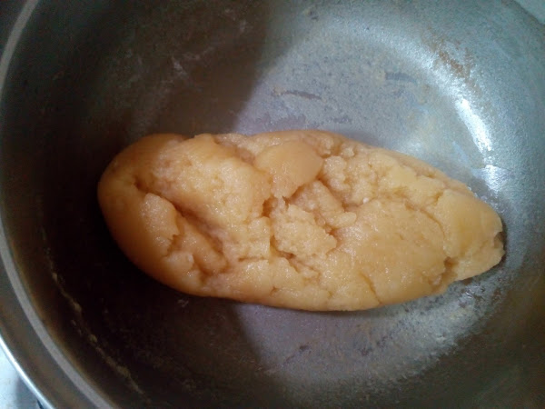 Volvemos a poner en el fuego (bajo) por un minuto o dos más, revolviendo constantemente con una cuchara de madera para que no se pegue, hasta que se vuelva una masa firme y se despegue de los lados.