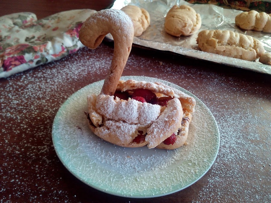 Espolvoreamos con azúcar glas y tenemos un bello cisne. Se verá más robusto si lo rellenas con nata montada (crema de leche) también :)